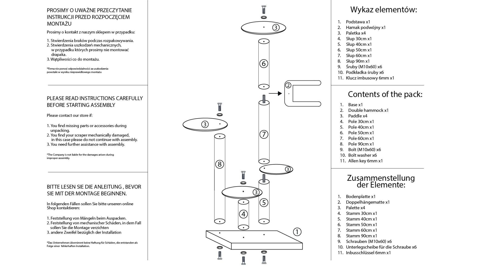 - Voller Garantie- und Nachgarantieservice, jederzeit können Sie einen beliebigen Bestandteil des Kratzbaums bestellen (auch wenn das Modell zurückgezogen wurde, sind alle Bestandteile weiterhin als Ersatzteile verfügbar)